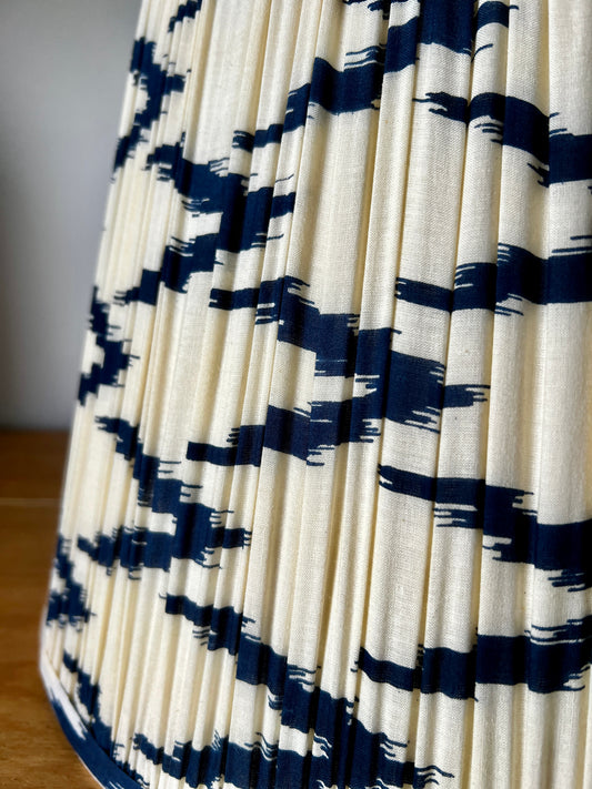 Elevate your space with our exquisite Ikat Fabric Gathered Lampshades, meticulously crafted to showcase the ancient art of ikat weaving. Originating from traditional techniques dating back centuries, ikat involves a meticulous process where artisans tie and dye yarns before weaving, creating stunning patterns that appear blurred or feathered.